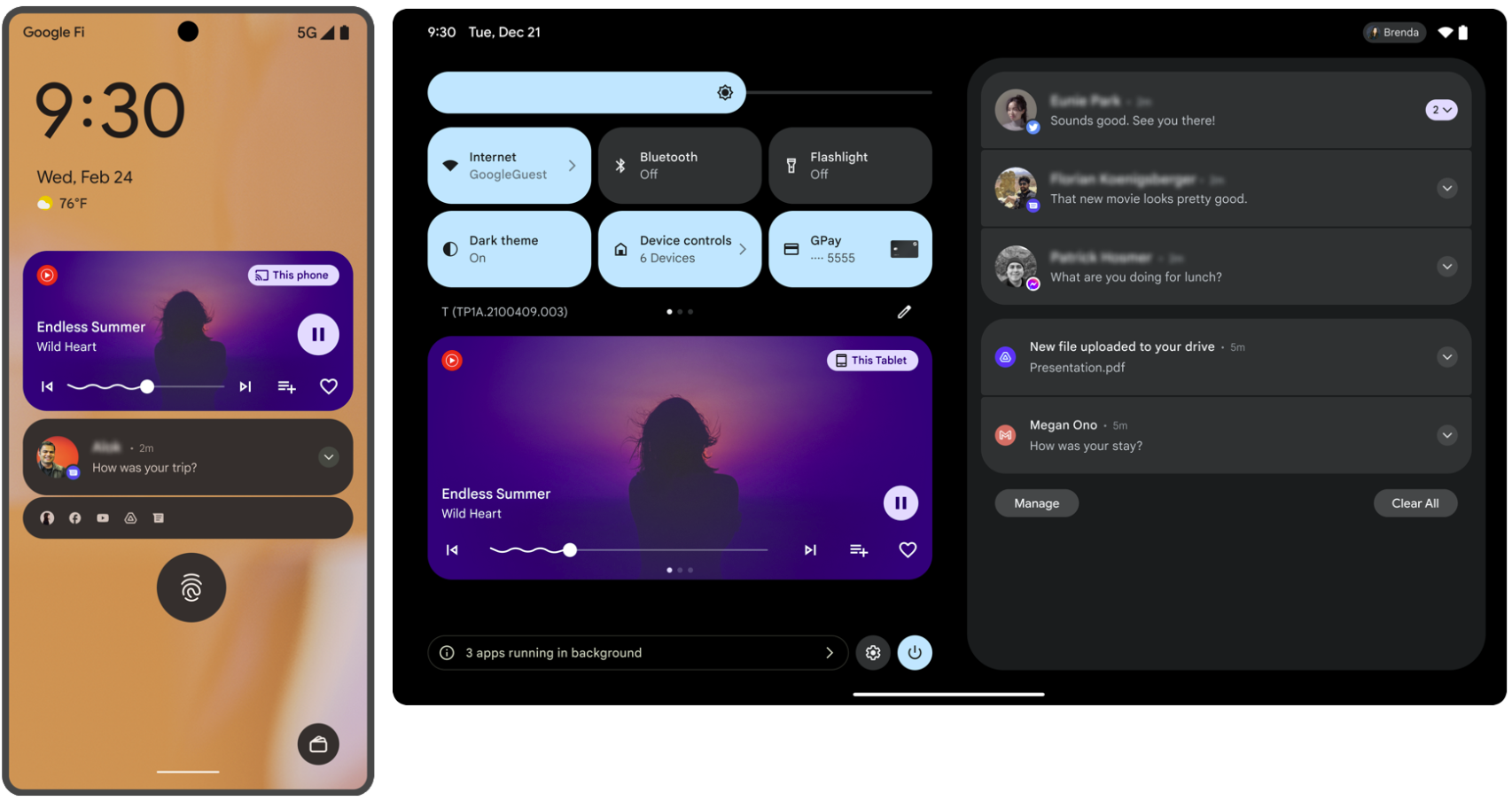 Android 13(API 수준 33) 이상을 타겟팅하는 앱의 경우 시스템은 PlaybackState 작업에서 미디어 컨트롤을 가져옵니다. 이를 통해 시스템은 스마트폰과 태블릿 기기 사이에 기술적으로 일관된 더 풍부한 컨트롤 세트를 표시할 수 있고 Android Auto 및 Android TV와 같은 다른 Android 플랫폼에서 미디어 컨트롤이 렌더링되는 방식과도 일치할 수 있습니다.
