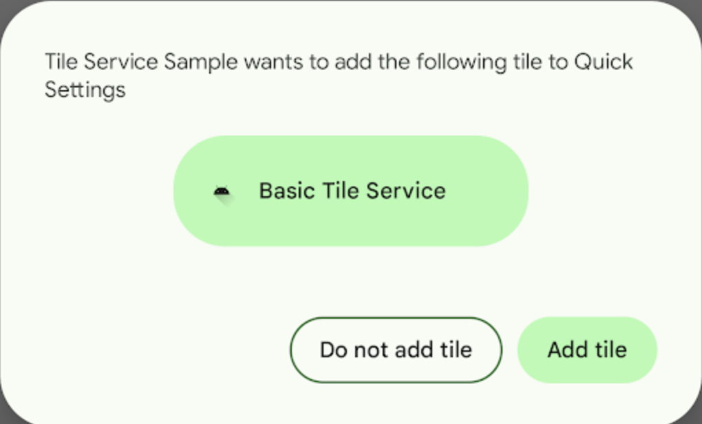 알림 창의 빠른 설정을 사용하면 사용자가 앱의 컨텍스트 내에서 편리하게 설정을 변경하거나 빠른 작업을 할 수 있습니다. 맞춤 타일을 제공하는 앱의 경우 사용자가 더 쉽게 타일을 찾아 빠른 설정에 추가할 수 있습니다. 새 tile placement API를 사용하면 이제 앱에서 사용자에게 활성화된 빠른 설정 타일 세트에 맞춤 타일을 직접 추가하라는 메시지를 표시할 수 있습니다. 새 시스템 대화상자를 사용하면 사용자가 빠른 설정으로 이동하여 타일을 추가할 필요 없이 앱을 나가지 않고도 한 번에 타일을 추가할 수 있습니다.