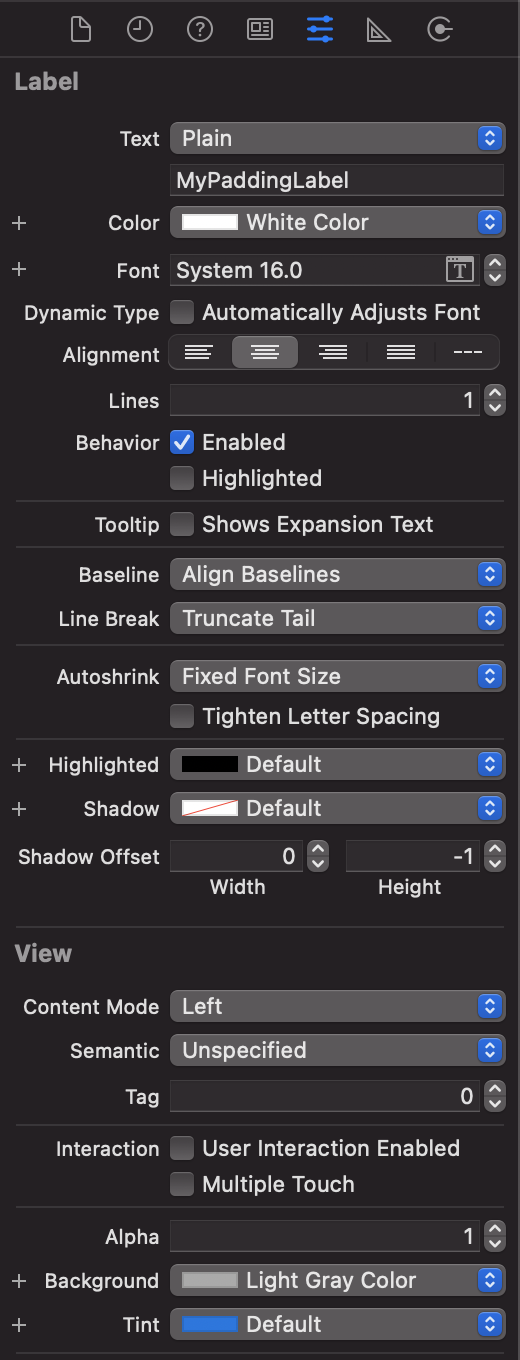그러면 Attributes Inspector에 아래와 같이 My Padding Label에 4개의 속성이 추가된 것을 확인할 수 있는데