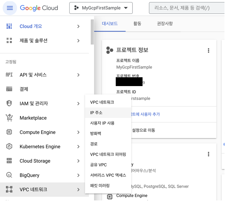 다시 프로젝트 대시보드로 이동해서 "VPC 네트워크"의 "IP 주소 선택"을 클릭합니다.