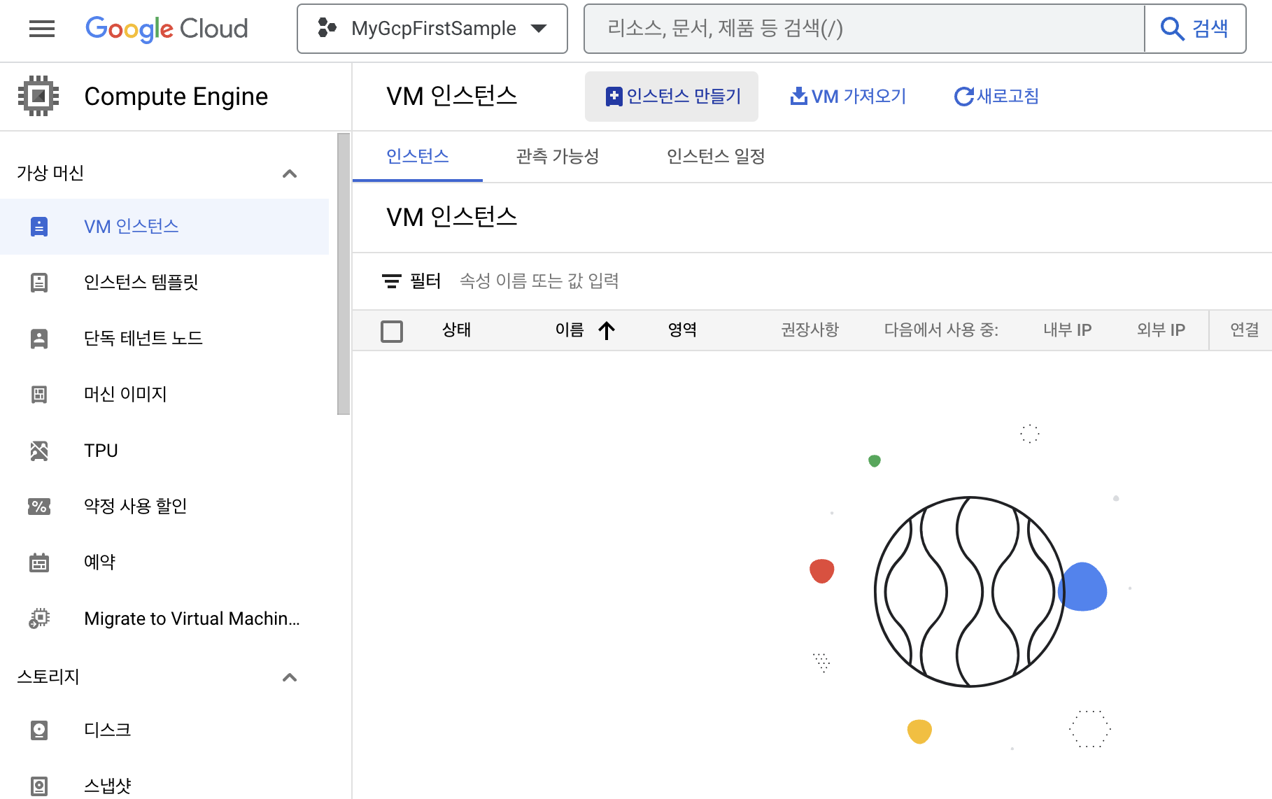방금 전 생성된 프로젝트를 선택하고 좌측 메뉴에서 "Compute Engine" > "VM 인스턴스"를 클릭합니다.