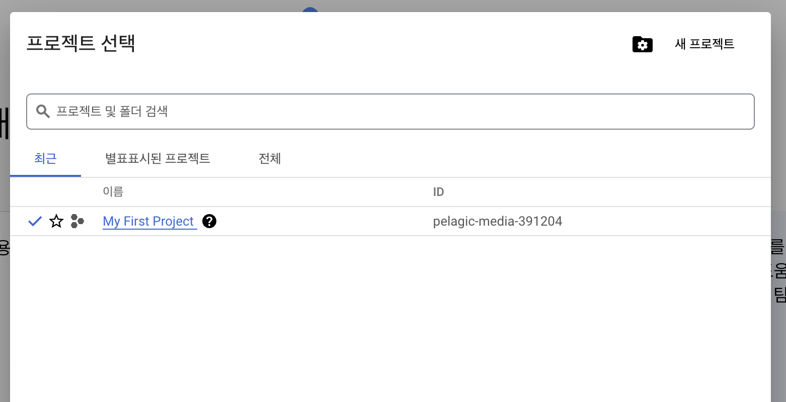 상단의 기본 "My First Project" 버튼을 클릭해 프로젝트 선택 팝업이 뜨면 상단 우측의 "새 프로젝트"를 클릭 합니다.
