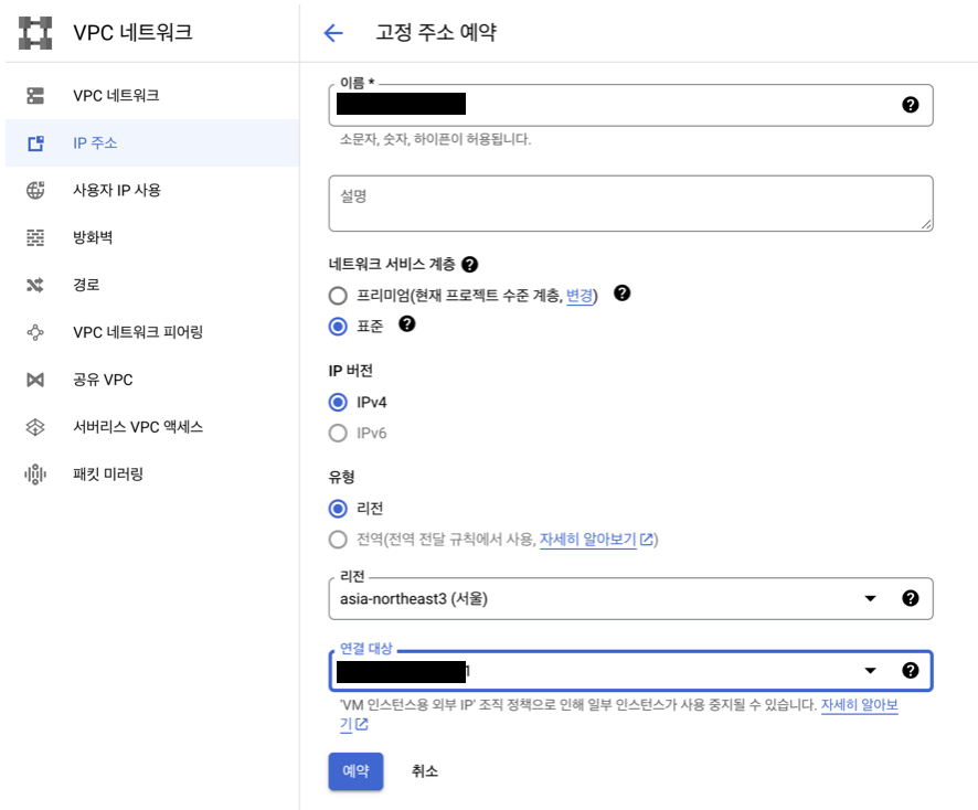 아래 고정 주소 예약 화면에 고정 IP 관련 정보를 입력하고 연결 대상으로 방금 전 생성한 인스턴스 선택 후 “예약” 버튼을 클릭합니다.
