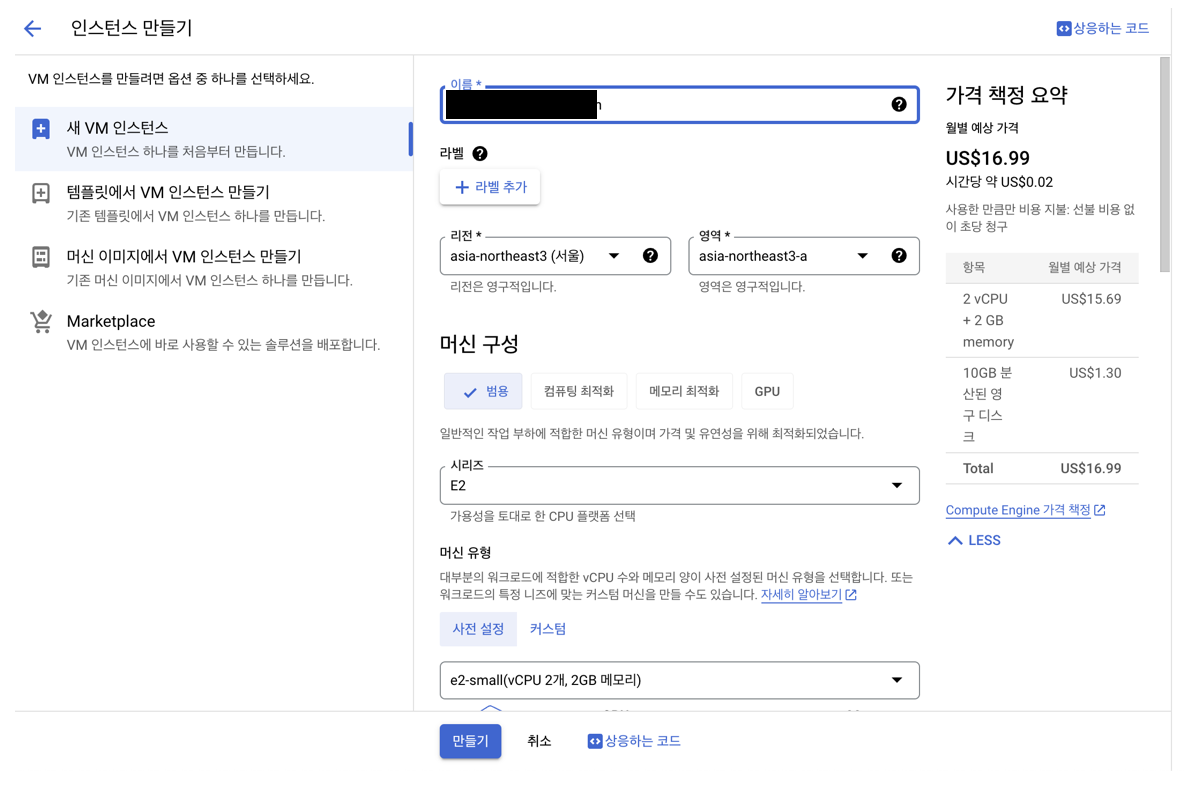 아래 그림과 같이 새로운 VM 인스턴스의 정보를 입력하라고 나오는데 아래와 같이 나에게 맞게 정보를 입력합니다.
