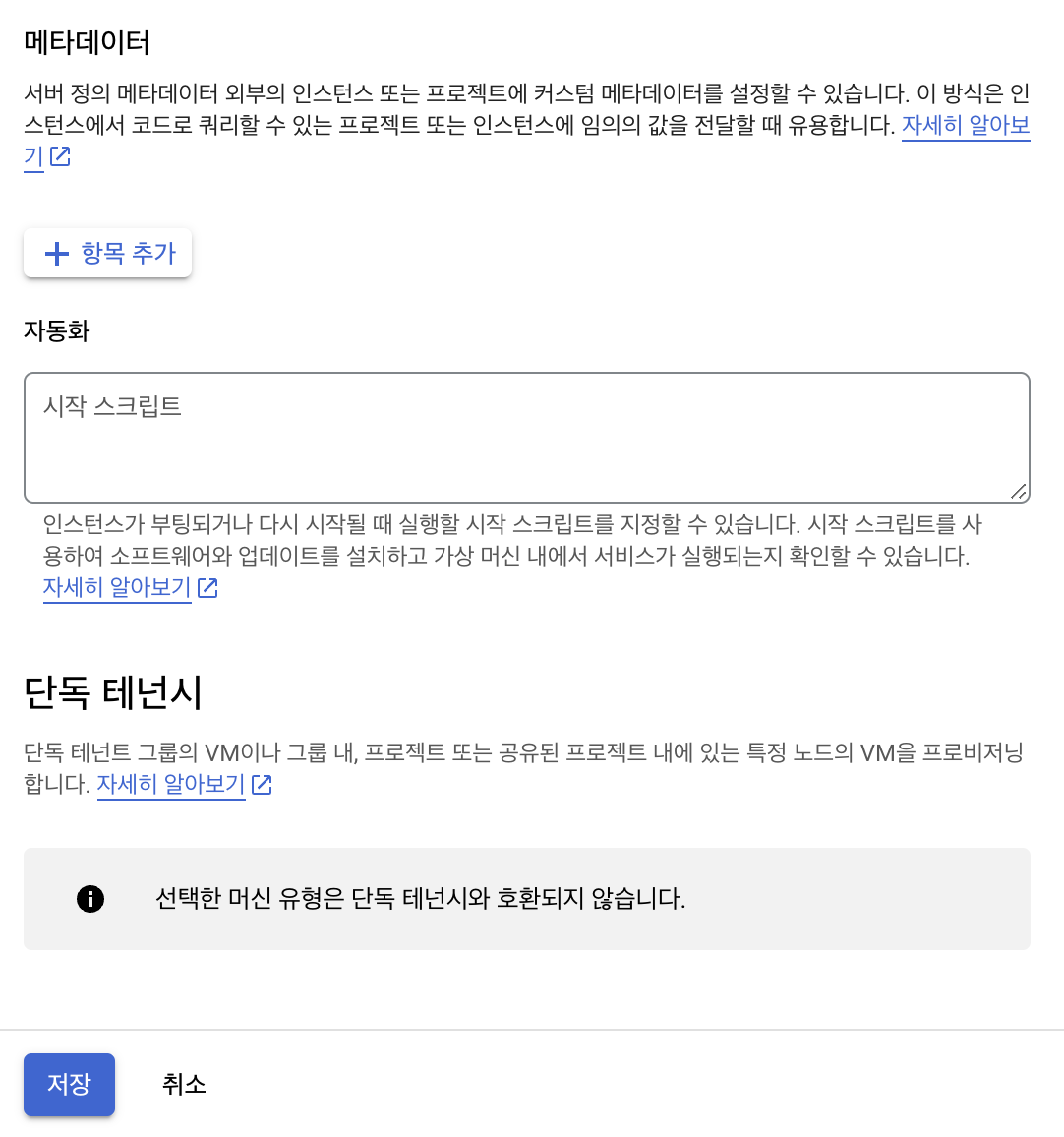 하단 “메타데이터” 섹션의 자동화 시작 스크립트 부분에 시작시 실행할 스크립트를 아래와 같이 작성하고 “저장” 버튼을 클릭합니다.