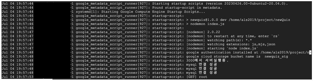 타이밍 문제인가? sleep도 추가해보고, chmod로 권한도 바꿔보고 root 폴더에 스크립트 파일을 만들고 해당 스크립트 파일을 실행 시키도록 바꿔도 보고, 이것 저것 삽질만 2시간 넘게하다가... 설마하는 생각에 startup-script를 아래와 같이 바꿔서 다시 실행하고 로그를 보니...