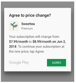 정기 결제 가격을 인상할 때는 Google Play에서 알림을 시작하기 전에 7일 이상 기존 정기 결제 사용자에게 가격 변경에 관해 알릴 수 있습니다. Google Play에서 사용자에게 알릴 경우 아래 그림과 비슷한 대화 상자가 표시됩니다. 이 대화상자에는 이전 가격, 새 가격, 새 가격이 적용되는 날짜가 표시됩니다.