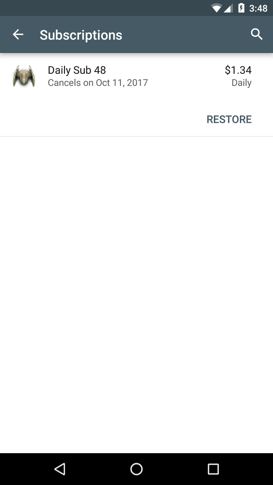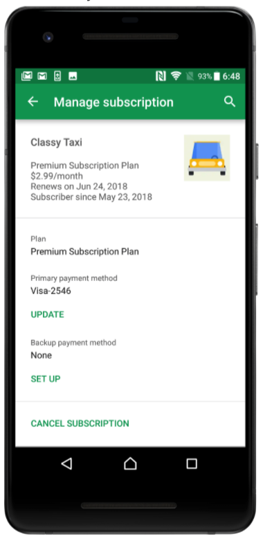 앱은 사용자에게 정기 결제가 취소되었음을 알리는 메시지(예: "2020-10-13, 11:02에 정기 결제가 만료됩니다.")를 앱에 표시하려고 할 수 있습니다. 또한 앱은 Google Play 스토어로 딥 링크를 설정하여 사용자가 정기 결제를 복원하도록 할 수도 있습니다.