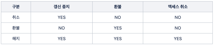 개발자가 해지할 때 사용자는 정기 결제 액세스 권한을 즉시 잃게 됩니다. 예를 들어 사용자가 제품에 액세스하지 못하게하는 기술적 오류가 발생했으며 사용자가 제품을 계속 사용하지 않으려는 경우에 해지를 사용할 수 있습니다. 앱은 해지에 설명된 대로 이러한 취소를 처리해야 합니다. 아래 표에서는 취소, 환불 및 해지의 차이점을 보여줍니다.
