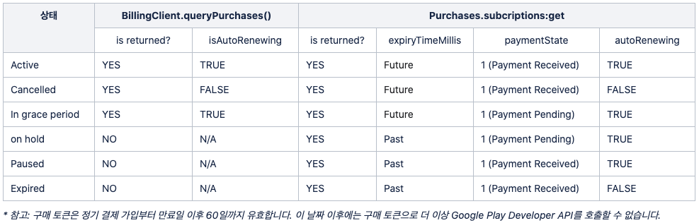 정기 결제가 성공적으로 갱신되면 그 정기 결제는 BillingClient.queryPurchases()에 의해 계속 반환됩니다.
