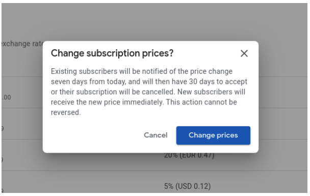 이 대화 상자에서는 가격 변경이 신규 정기 결제 사용자 및 기존 정기 결제 사용자에게 영향을 주는 방식을 설명합니다.