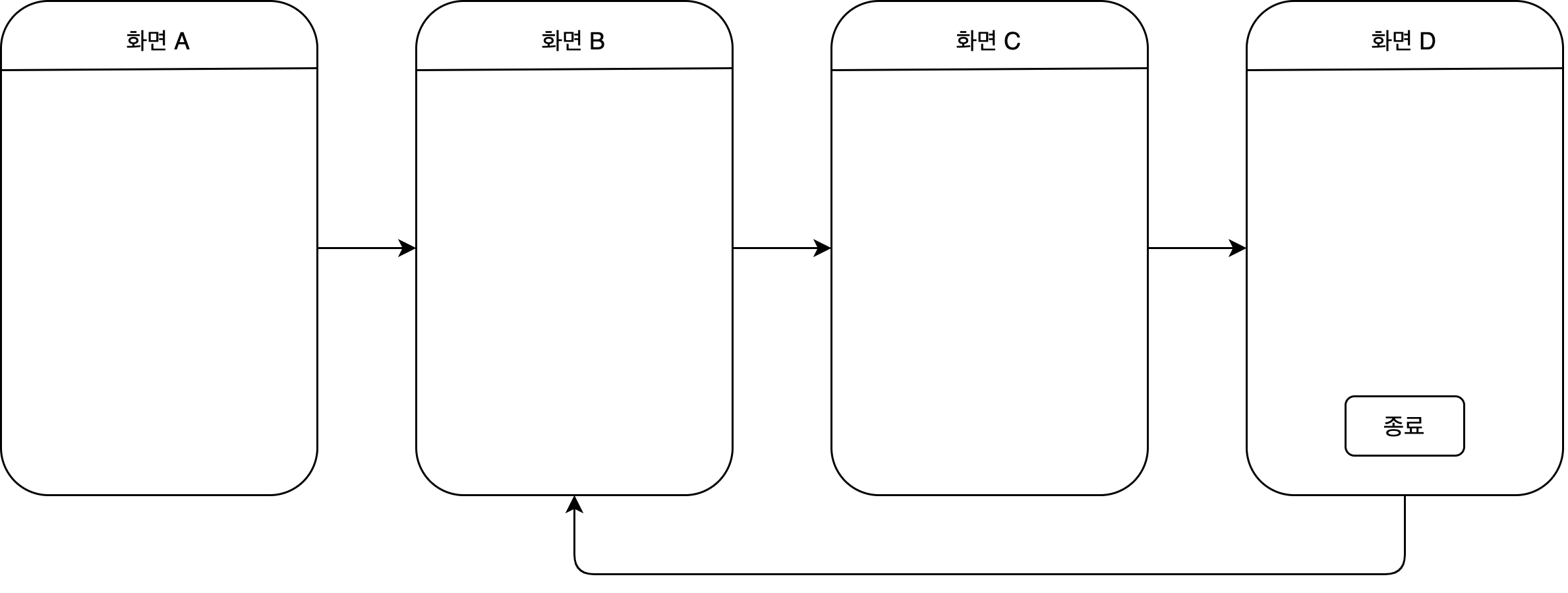 화면 A를 ActivityA로 만들고 화면 B,C,D를 Fragment로 만든 다음에 해당 Fragment들을 관리하는 ActivityBCD를 만들면