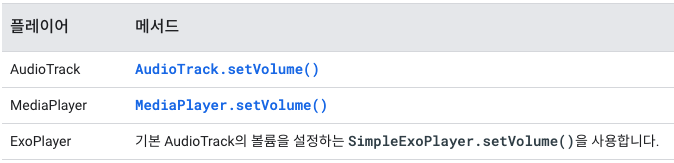 오디오 앱은 동일한 스트림에서 재생할 수 있는 다름 앱과 출력 볼륨의 균형을 맞출 수 있어야 합니다. 고정 볼륨기기에서 앱은 자체 볼륨 컨트롤을 아래의 표에 나와 있는 적절한 setVolume() 메서드에 연결해야 합니다.