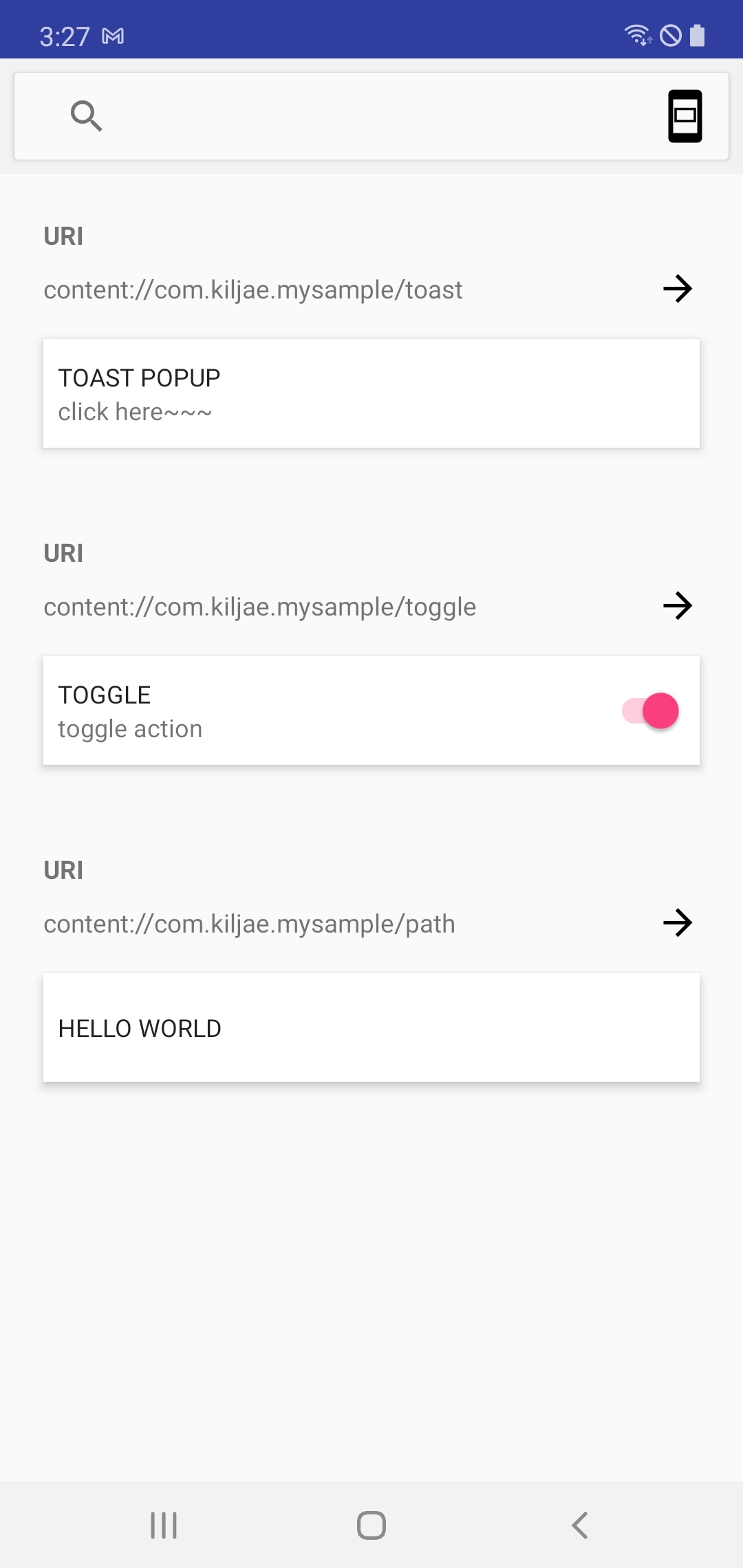 Slice 뷰어를 실행 해 “com.kiljae.mysample/toast”를 입력하면 아래 그림과 같이 생성한 Slice가 보여지고