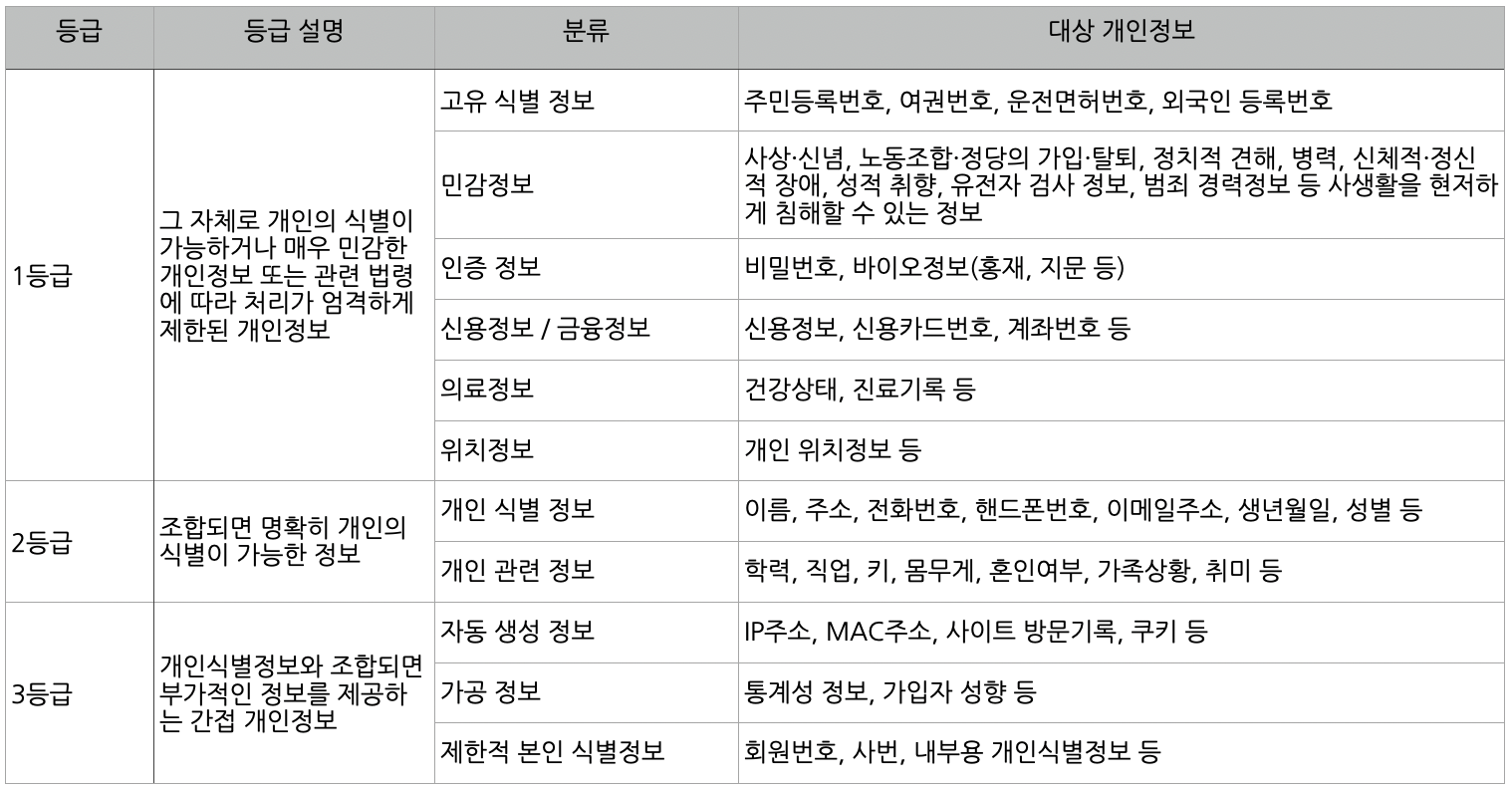 이러한 개인정보를 등급으로 구분해보면 아래와 같습니다.