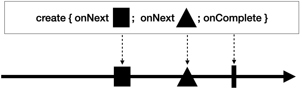Create()는 직접적인 코드 구현을 통해 옵저버 메서드를 호출하여 옵저버블을 생성합니다.