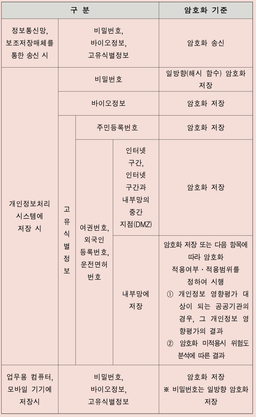 “2020년 12월 개정된 개인정보 보호 위원회의 개인정보 암호화 조치 안내를 보면 법령”을 보면 개인정보의 종류 그리고 구간에 따라 아래 표와 같이 관리하도록 기준을 정하고 있습니다.